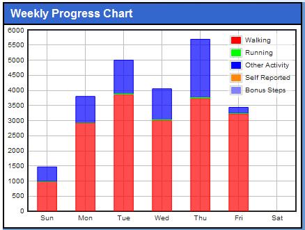 A slightly better week, with nearly 2 days above 5,000 steps. Thursday is once again helped along by bowling. Saturday say a downturn in the weather which led to me not leaving the house at all. The weather is supposed to improve this week, so hopefully the step improvement will continue.