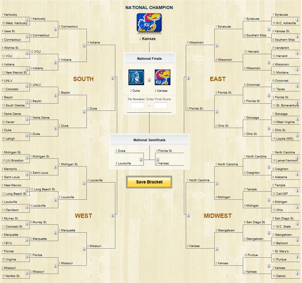 Well, it’s that time of year again. I’m in three different pools this year, one at work, one at my mom’s work, and my friend Tom’s pool. This first bracket is entered in all three.
