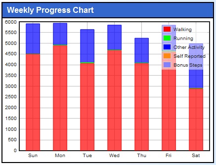 24 steps. That’s how close I came to an entire week of 5000 step days for the first time since September and the trip to Belfast. The week started with a trip to Brookfield Zoo on Sunday for Breakfast with the Bunny, despite a temperature in the lower 30s. Nothing out of the ordinary during the week, other than a concerted effort to keep the streak going. Saturday’s result is disappointing, considering it was the nicest weather we had all year, but it conflicted with a Dr. Who marathon on BBC America. Honestly, I’m surprised the total was as high as it was.