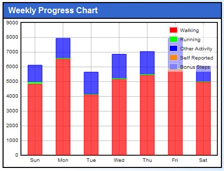 Well, this turned out to be the best week in some time, with every day over 5000 steps and all but one over 6000. Sunday benefited from a trip down to Wrigley Field for exciting Cub baseball. The work week saw me spend plenty of time gallivanting around the campus trying to find a way to get the tracker to be recognized. Friday and Saturday were helped along by exciting White Sox baseball.