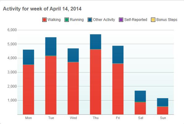 A disappointing week as we got back in the swing of things post vacation and post sickness. Only 2 days managed to break the 5000 step barrier, and those did not surpass it by much. The weekend was its normal horrible self, which was even worse since the weather was nice for once. Sunday does get a reprieve as it was the Easter holiday, which kept me inside the house all day.