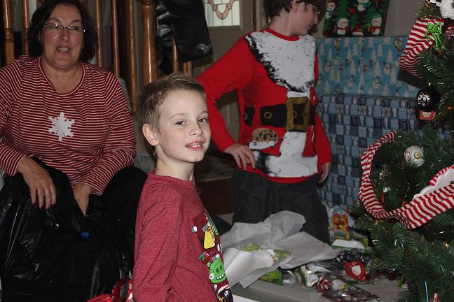 We finish up the year with a photo of Michael opening gifts from Christmas 2013, wearing the same thing he wore for Christmas 2014. We’ll see in a scant 24 days if he’s grown at all this year, or if he can fit in to the same outfit 3 years in a row.