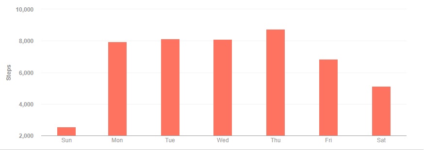 Another disappointing week, as I failed once again to meet my weekly goal. Things got off to a slow start on Sunday, as I barely managed to pass 2500 steps. Things got better, and pretty consistent, between Monday and Wednesday, as I finished each day within 132 steps of 8000. Thursday was the big day of the week, scoring over 8700 steps. Friday fell just short of 6900 steps, and then Saturday was down again, falling to just over 5100 steps.
