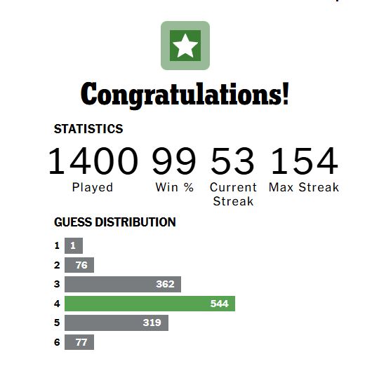In early February of 2022, I, along with millions of others, came across a little game called Wordle.  In the nearly four years since, the game was bought out by the New York Times and it, along with some of their other games, has become a daily constant and part of my normal morning routine.  Earlier this week, I played my 1400th game while also raising my overall winning percentage back to 99%.