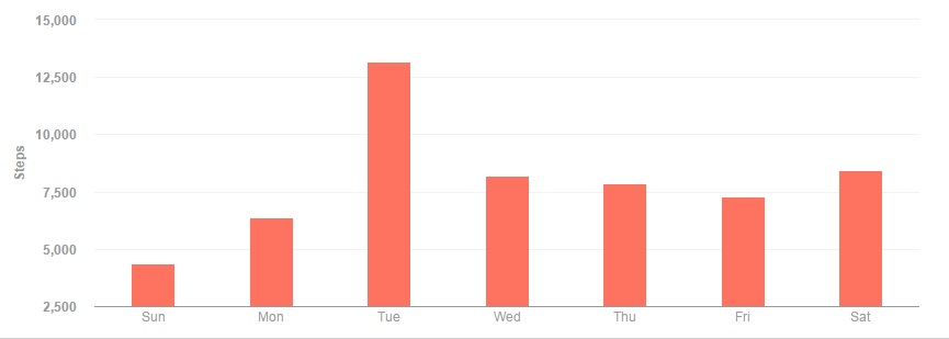 Another decent week, my second straight back over 50,000 steps. The week got off to what is starting to be a typical slow start, as I just managed to get past 5000 steps on Sunday despite going to Guaranteed Rate Field to watch the White Sox. Monday was the big day of the week, as I walked over to Willow for my biometric screening and then did some additional walking during the day to make up for my poor numbers. Tuesday was another big day, surpassing 9200 steps, thanks to another trip to the South side after work to see the Yankees battle the Pale Hose. Wednesday just barely managed to surpass 6500 steps, due to a post-work trip to CarMax to see what, if anything, the Prius was worth. Thursday had a trip to North plaza and an extra trip back and forth to the car to make up its total of 8800 steps. Friday was just shy of 7400 steps, thanks to work, a trip to Tesla to pick up my new car, and then a wake. Saturday eked past my step goal by 27 steps, aided in part by a third trip to the ballyard.