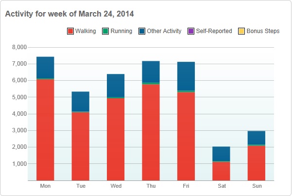 Another work week where every day surpassed the 5000 step mark. The weekend also showed a slight improvement, thanks to taking care of a sick family member.