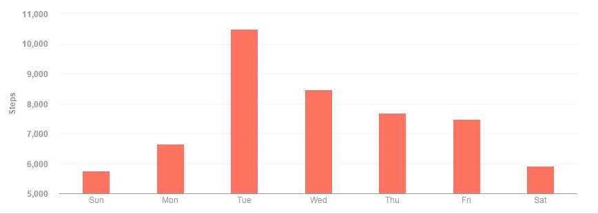 Another pretty good week, as my streak of days surpassing my daily goal of 5500 steps reached 49 days and, after a week off, I managed to surpass 10,000 steps during the week. Things got off to a slowish start on Sunday, where a trip to US Cellular Field was barely able to push me past my goal. Monday got the work week off to a decent start, followed by Tuesday’s 10,000 step day, thanks to after-work activities with Danny and Michael.