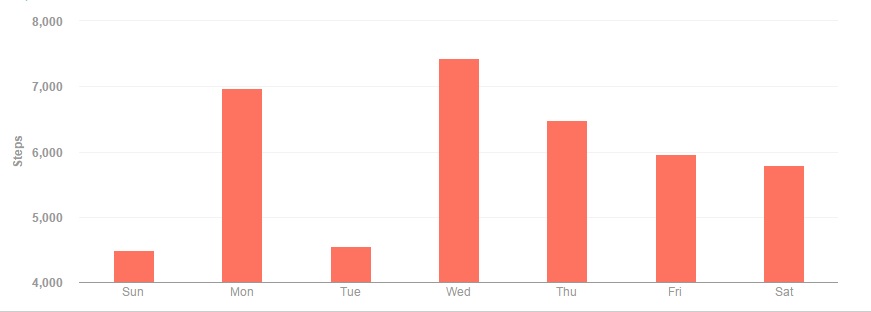 A disappointing week, with 2 days falling under my 5500 step goal, and ending with my lowest total since late April. The week got off to a slow start on Sunday, where I lounged around the house all day and finished under 5000 steps. Monday bounced back with nearly 7000 steps, but Tuesday fell below 5000 once again, thanks to missing an afternoon coffee run. The rest of the work week went back to normal, all finishing well above the 5500 step goal. Saturday also managed to hit the goal, thanks to a trip to the grocery store and some gallivanting around the house.