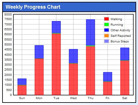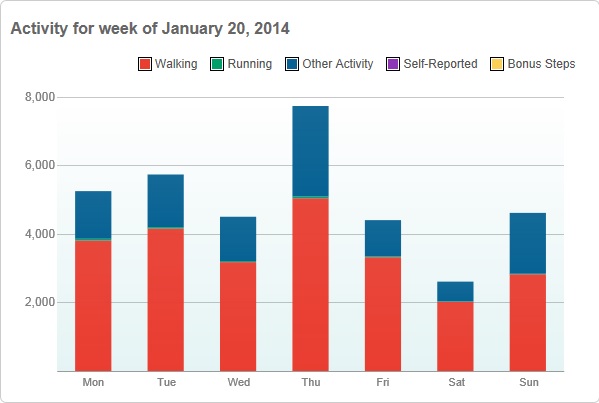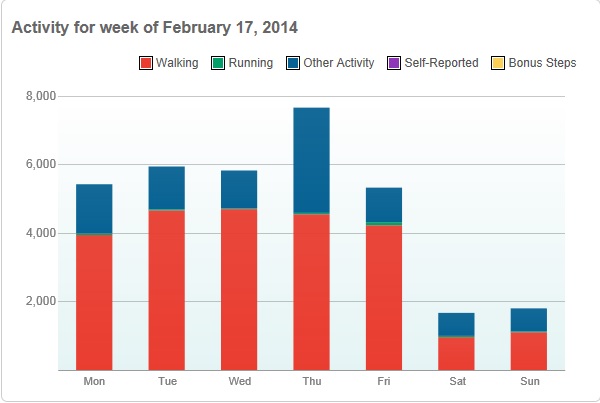 The week got off to an odd start as the temperature broke 50 degrees for the first time all year on Monday, but an overturned semi gave me my second 2 1/2 hour plus commute to work in under a week.  Despite that, and thanks to a meeting in North plaza in the morning and a coffee run in the afternoon, I was able to put up a pretty good total.  Tuesday finished a mere 60 steps below the 5000 step mark, mainly due to my decision to not wear the tracker when I got home from work.  Yet another snowstorm kept me home on Wednesday, which led to the day’s small total.  Thursday was a good bounce back day, thanks to my last night of bowling for the season.  Friday finished off the pretty decent week, before yet another horrid weekend performance.