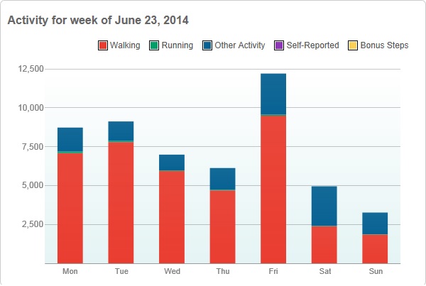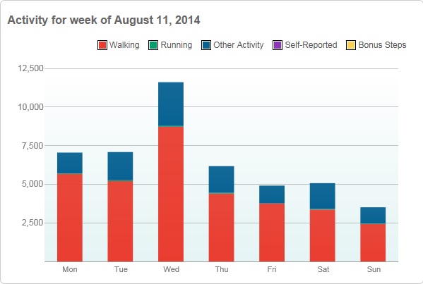 Y3Week51Another pretty good week, with my highest total since heading to San Diego back in April, with the entire work week surpassing 6000 steps and 3 of the days above 8500.  Nothing too far outside the norm until Friday, where a trip to US Cellular Field for Grinder Bash pushed my total well above 12,000.  Saturday was disappointing only in that I finished a scant 48 steps below the 5000 step mark despite a trip to the mall and a bowling outing.  Sunday, while well below my goal of 5000 steps, did manage to have more than the negligible amount I have been getting.