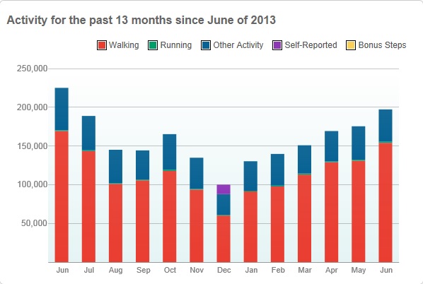 Right off the bat, we can see that the average steps per day is up by 44 steps.  One goal is to get this back up over the 5000 step mark, and that seems to be on target.  To achieve 2.25 million steps by the end of the year, my calculations say that I should have accomplished 692,308 steps by this point.  As of the end of last week, I am at 571,204.  That pace puts me at under 1.9 million for the year, which is quite a bit off of my mark.  To make up the difference, I would need to add approximately 11,000 additional steps per week.