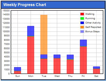 Overall, it was not a great week, though that will be masked somewhat thanks to Saturday’s huge total, which ranks as my second highest day since I started this endeavor 2 years and 3 weeks ago. Only 3 days crossed the 5000 step day, although one of them far surpassed it and made the overall numbers for the week look good.