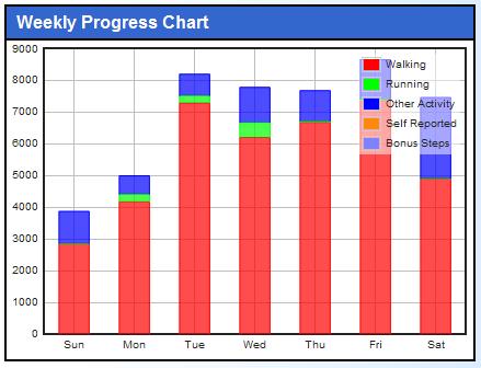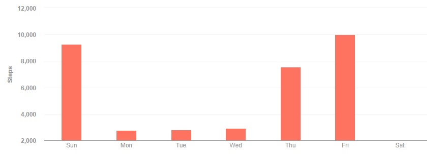 A horrible week, in more ways than one. I actually got off to a pretty decent start on Sunday, thanks to trips to Costco and the grocery store, which left me with over 6100 steps. I managed to surpass my daily goal on Monday by 92 steps. Tuesday, things fell apart as I came home to a ceiling leaking water from the upstairs to the downstairs and then into the basement. All of the running around trying to contain the damage left me with nearly 7100 steps. I worked from home on Wednesday to let in the salvage/cleaning crew and managed only 3200 steps. Thursday I put in half a day at work before coming home to see the destruction of the hardwood floor in the kitchen, gaining 3900 steps along the way. I was home again on Friday, which left me with only 3200 steps. Saturday was another black hole of a day, with a mere 3400 steps.