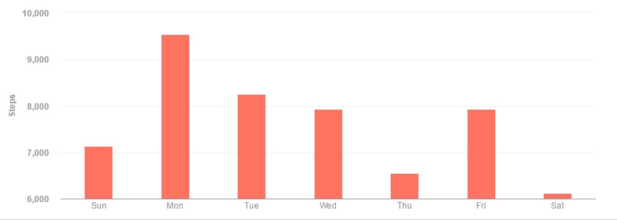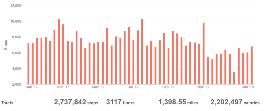 A year ago, I set a goal of 2,366,000 steps, an average of 6500 steps per day. Despite my Fitbit giving up the ghost in December and a 10 week downturn to finish out the year, I managed to easily surpass my goal, coming in with 2,737,842 total steps. My average step total per week was 52,650.81, which comes out to about 7521.544 per day. The median weekly total was 52,910.5. My best week was Week 9, which used a Jiff challenge to propel me over 70,000 steps for the week. My worst week was Week 48, where I slacked through the entire week between Christmas and New Years.